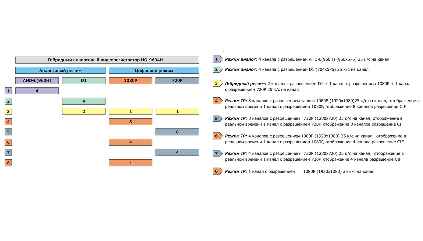 | Режимы | Гибридный / Ip / Ahd / Аналог |