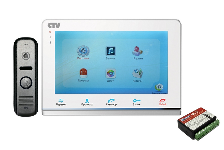 Комплект цветного видеодомофона в одной коробке для многоквартирных систем (антивандальная вызывная панель CTV-D1000HD, цветной монитор CTV-M2700TM, модуль сопряжения ДАКСИС ), панель 700 твл, монитор с экраном 7", Hands free, cенсорная панель управления с подсветкой, встроенная память, встроенный слот для micro SD (до 32ГБ), накладное крепление, встр. ист пит, подкл до 2 выз. панелей и 4 мониторов, цв. корпуса - белый/черный, модуль сопряжения с многоквартирными координатными/цифровыми подъездными домофонами МСК/МСЦ