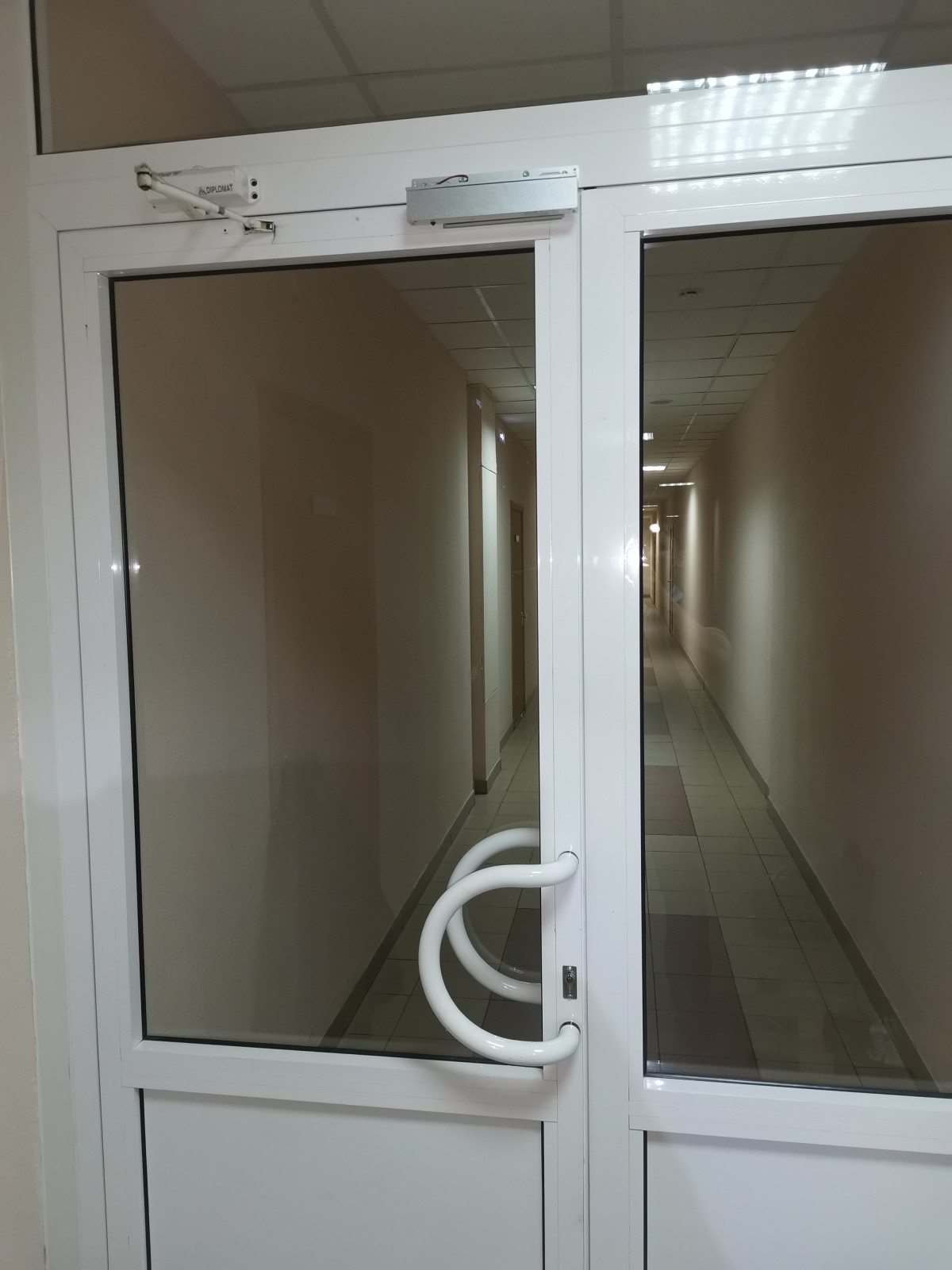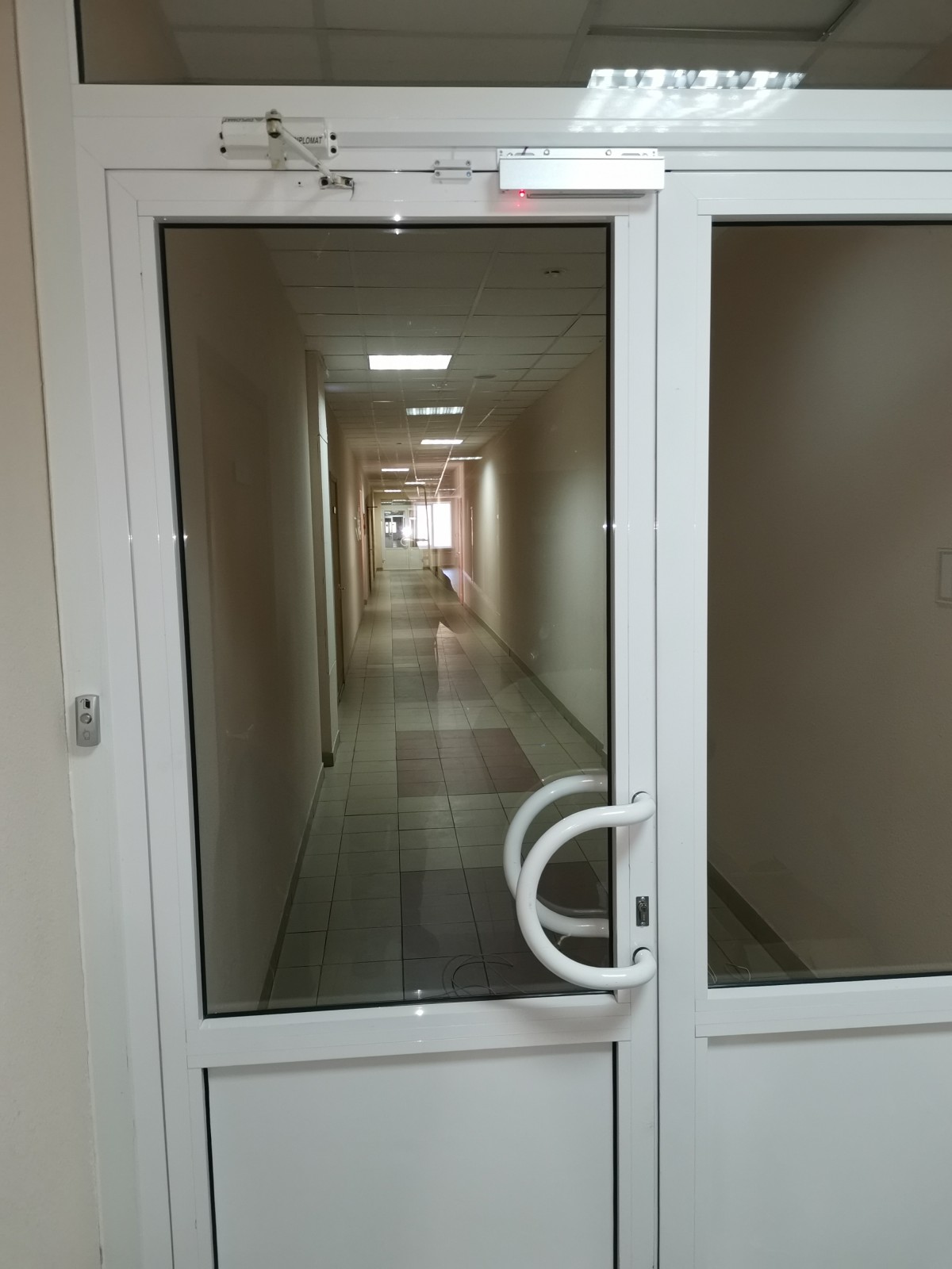 Организация занимает часть этажа офисного здания, задача ограничить доступ посторонних лиц в эту часть коридора, для этого необходимо установить СКУД на две коридоные двери, установить охранную сигнализацию на эти двери, на одну из дверей установить домофон для связи посетителей с секретарем, и последующая интеграция установленного оборудования в действующи системы безопасности здания: СКУД, в систему пожарной сигнализации для автоматического отрытия дверей при пожаре, в охранную сигнализацию.